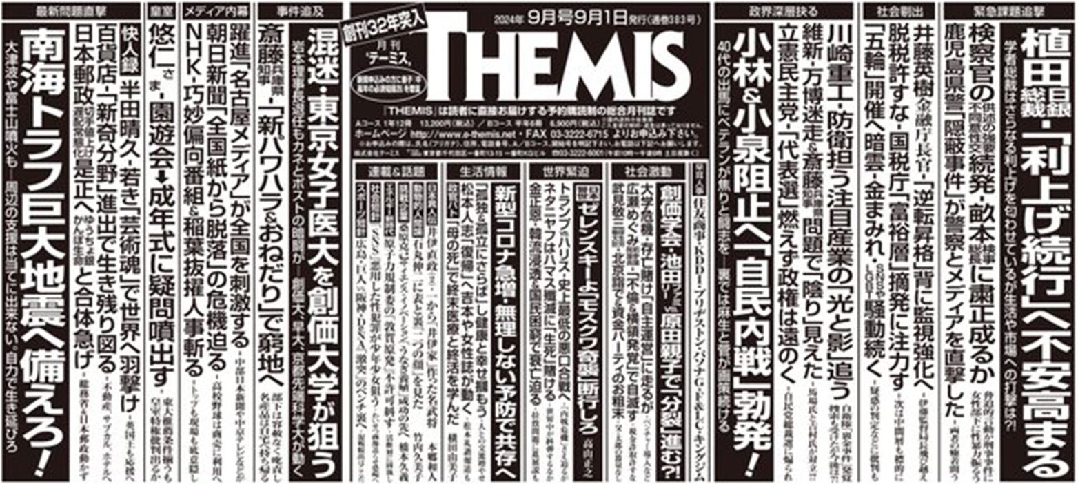 バックナンバー 2024年9月号 自民分断‐小林&小泉阻止へ「内戦」激化す/維新‐万博&斎藤兵庫県知事問題で「陰り」見えた/悠仁さま‐園遊会→成年式に疑問噴出す/朝日新聞‐「全国紙からの脱落」の危機迫る/トランプvs.ハリス‐史上最低の選挙戦へ サイズ:B5 1,250円(税込) 商品に関するお問い合わせはこちら
