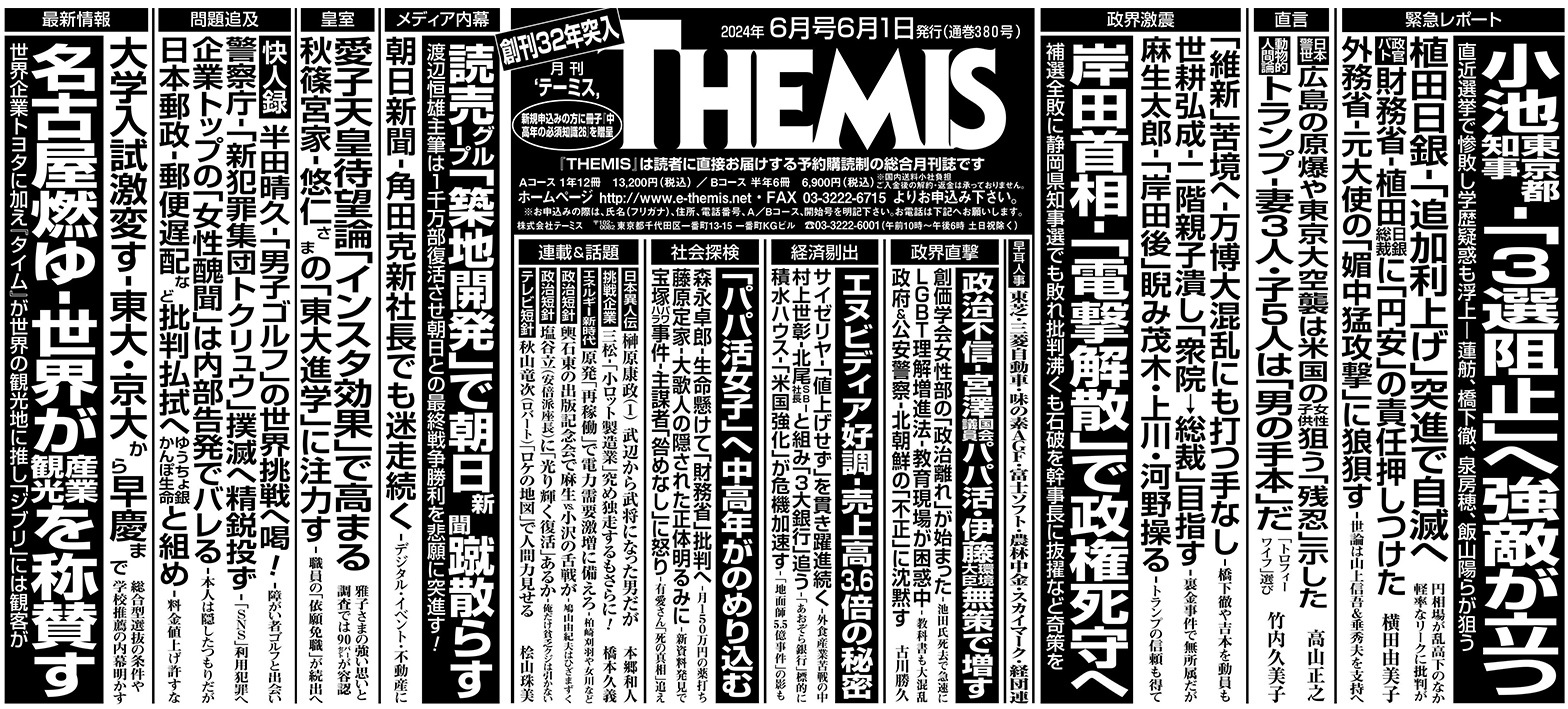 バックナンバー 2024年6月号 小池東京都知事危うし‐3選阻止へ「強敵」が立つ/植田日銀‐「追加利上げ」驀進で自滅へ/愛子天皇待望が「インスタ効果」で上昇も/歯周病を侮るな‐全身病を引き起こす サイズ:B5 1,250円(税込) 商品に関するお問い合わせはこちら