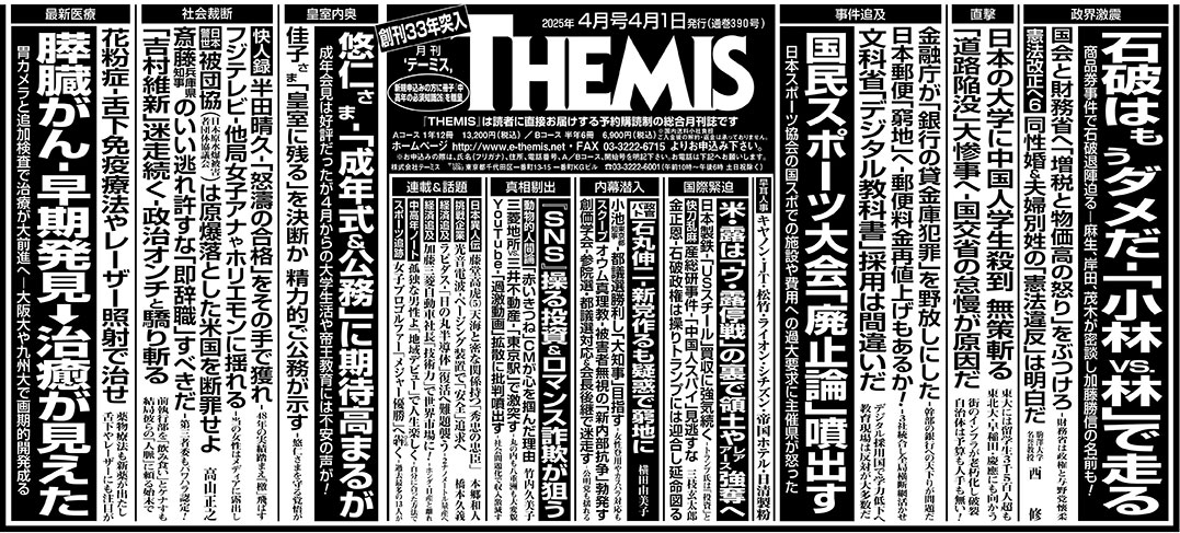バックナンバー 2025年4月号 国会&財務省へ「増税・物価高」の怒り放て/石破はもうダメだ‐「小林vs.林」で走り出す/金融庁が「貸金庫犯罪」を野放しにした/悠仁さま‐「成年式&公務」に期待高まるが/日本の大学に中国人殺到も危機感なし サイズ:B5 1,250円(税込) 商品に関するお問い合わせはこちら