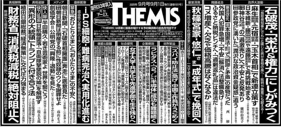 バックナンバー 2025年9月号 財務省「消費税減税」阻止へ政権操る/石破茂‐「栄光と権力」にしがみつく男/植田日銀‐「経済無策」に交代圧力強まる/秋篠宮家‐悠仁さま「成年式」で挽回図る/テレビ朝日‐「旧ジャニーズ」抱え首位へ/「iPS細胞」‐難病完治へ実用化進む/「異形の大統領」トランプと付き合う法 1,250円(税込) 商品に関するお問い合わせはこちら