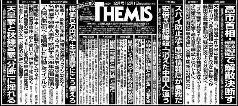 最新号 2025年12月号 スパイ防止法&国家情報局が急務だ/高市首相‐憲法改正&宗教課税で解散へ/株価5万円超‐生活直撃にこう備えろ/天皇家‐「秋篠宮家」との分断に揺れる/朗報!認知症予防に「帯状疱疹ワクチン」が効く/レアアース‐南鳥島採掘で中国抜け! 商品に関するお問い合わせはこちら